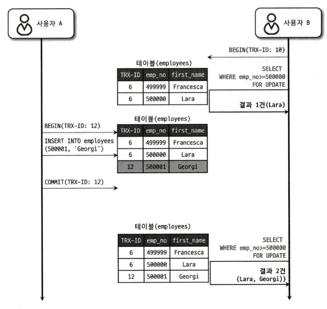 - 즉, 같은 트랜잭션 내에서 조회 결과의 행 개수가 달라지는 현상이 발생한다.