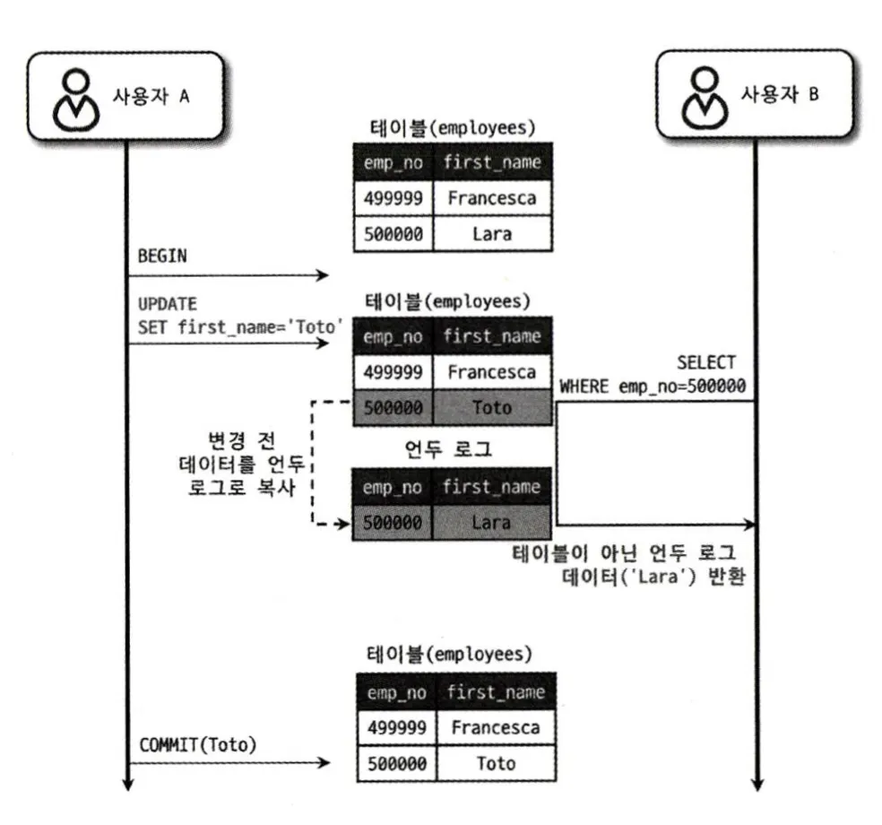 - 사용자 B가 A의 COMMIT 전에 해당 사원을 조회하면, Undo Log에 백업된 레코드가 반환되므로 여전히 ‘Lara’로 조회된다.