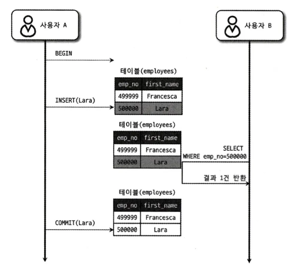 - 만약 사용자 A가 도중에 오류로 인해 ROLLBACK을 수행하더라도, 사용자 B는 이미 ‘Lara’를 정상적인 사원으로 인식하고 후속 작업을 계속 진행할 수 있다.