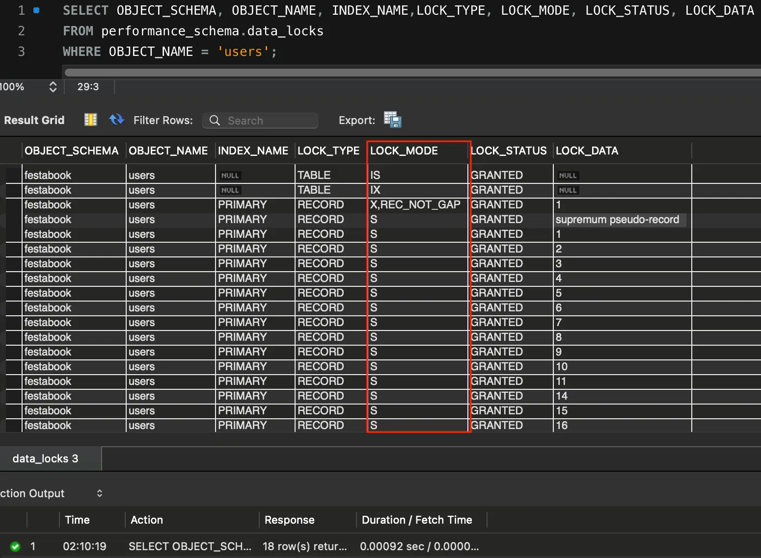 SELECT * FROM users FOR SHARE; -- 테이블 전체에 S 락 계열 걸림