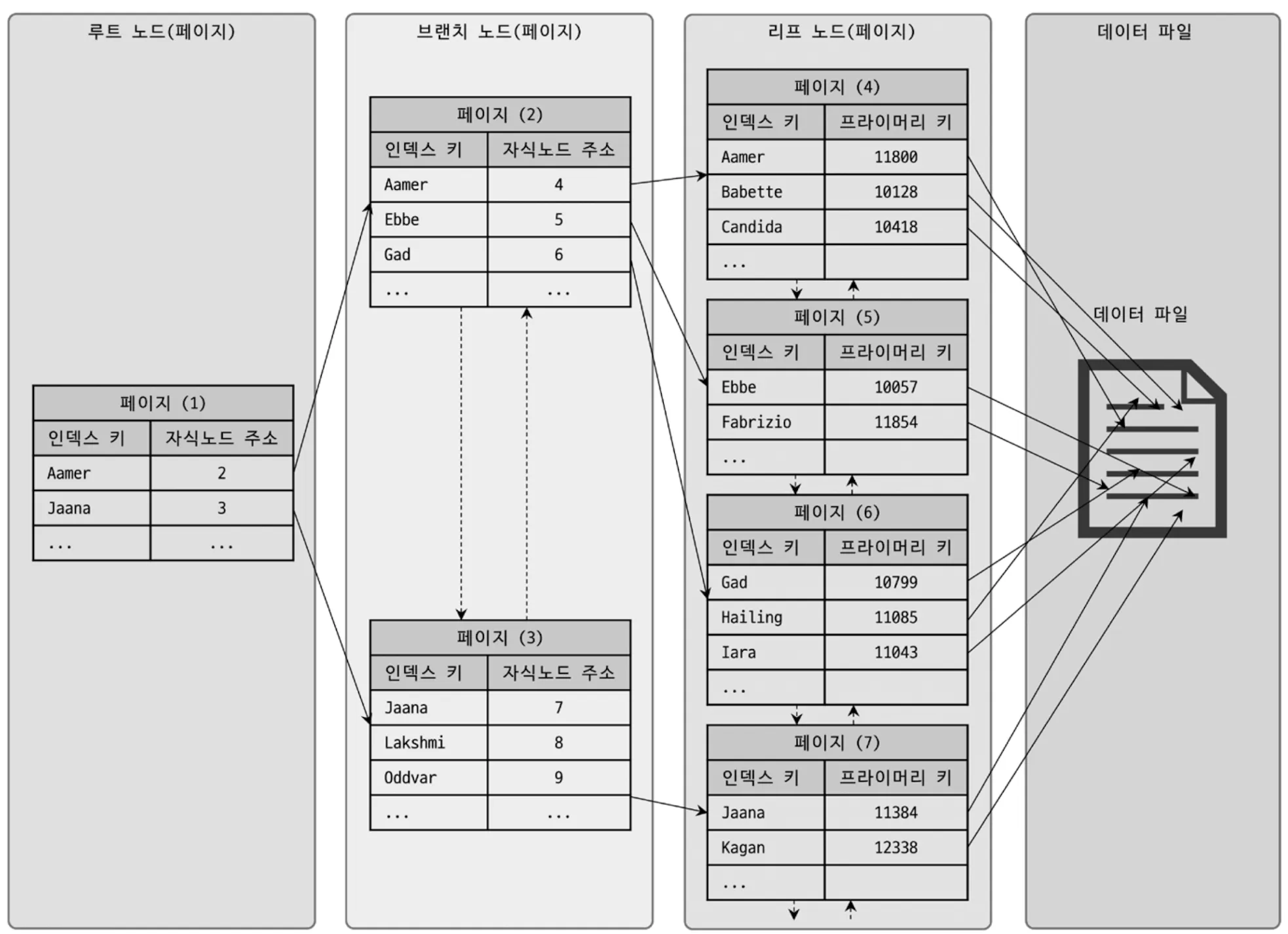 - 리프 노드(Leaf Node)는 가장 하단에 위치하며, 실제 데이터 레코드를 가리키는 주소값을 저장한다.