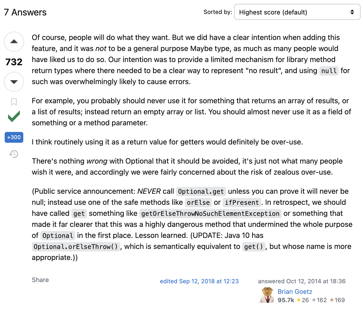 Brain Goetz는 Optional을 만든 의도에 대해, "결과 없음"을 명확하게 표현할 수 있는 방법이 필요한 라이브러리 메서드 반환 유형을 위한 제한된 메커니즘을 제공하는 것이라고 말했다. 하지만 실제로는 사람들이 의도와 다르게 사용하는 경우가 많아 주의할 점이 많다고 한다. (이래서 코틀린을 써야 하는 건가...?)