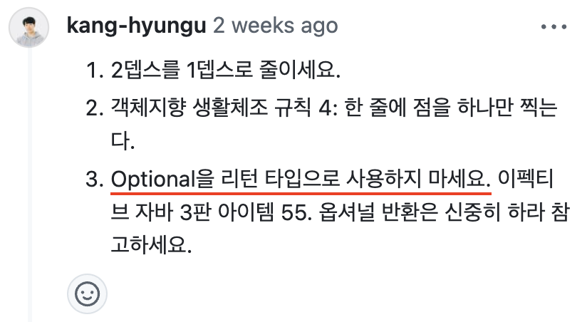 - Optional을 사용했지만 실제로는 null 체크와 다를 바 없는 불필요한 래핑이다.